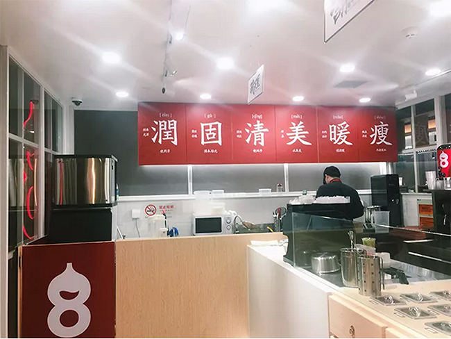 Q:这个体验和引导,具体是怎样操作的呢?上海店并不大,为什么要突出空间放中草药调料台和“润固清美暖瘦”大字招牌呢?
