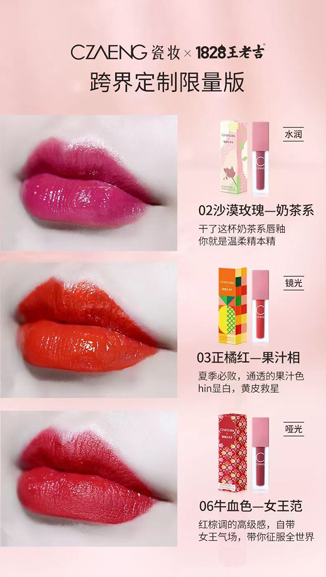 除此之外,最近王老吉店内还有口红试色的活动,口红是王老吉和国货品牌瓷妆跨界推出的期间限定产品,根据王老吉的不同饮品,一共推出了三种颜色质地的口红,从水润到哑光,粉色到深红,满足各种奶茶女孩的精致需求。心动的话可以马上行动,不贵,69元/支,不就是少喝两杯奶茶吗~